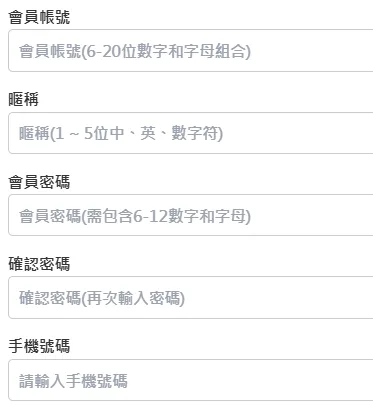 4. 依序輸入您的手機號碼、電子郵件、帳號名稱及密碼(並收手機驗證碼)